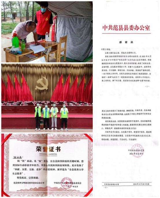 他无私奉献,冲锋在前,曾受助于国家助学贷款和助学金,努力发挥先锋模范作用。被选拔为“青年马克思主义者培培养工程”学员并顺利毕业。参与中国共产党范县第十五次代表大会志愿者,为党代会的顺利召开提供了高质量服务,受到提名表扬并颁奖证书和感谢函。疫情期间积极投身家乡志愿服务,获得“全县优秀大学生志愿者”荣誉证书。